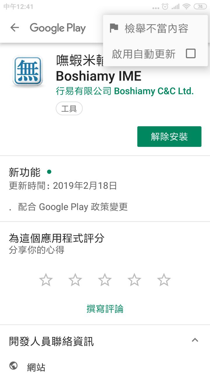 嘸蝦米 (Boshiamy IME) Android 版,自從 2019/02/18 釋出 v2.6.4 後,除造成不少 Android 用戶無法正常使用嘸蝦米,還會一直跳出「未預期中止的錯誤訊息」視窗阻礙操作。相信部份使用者,正因如此花錢 (NT$200) 另購嘸蝦米輸入法 Pro (Android 版)。
